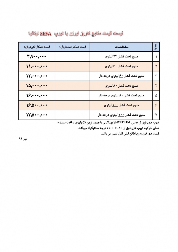لیست قیمت منابع کاریز ایران با تیوپ سفا ایتالیا